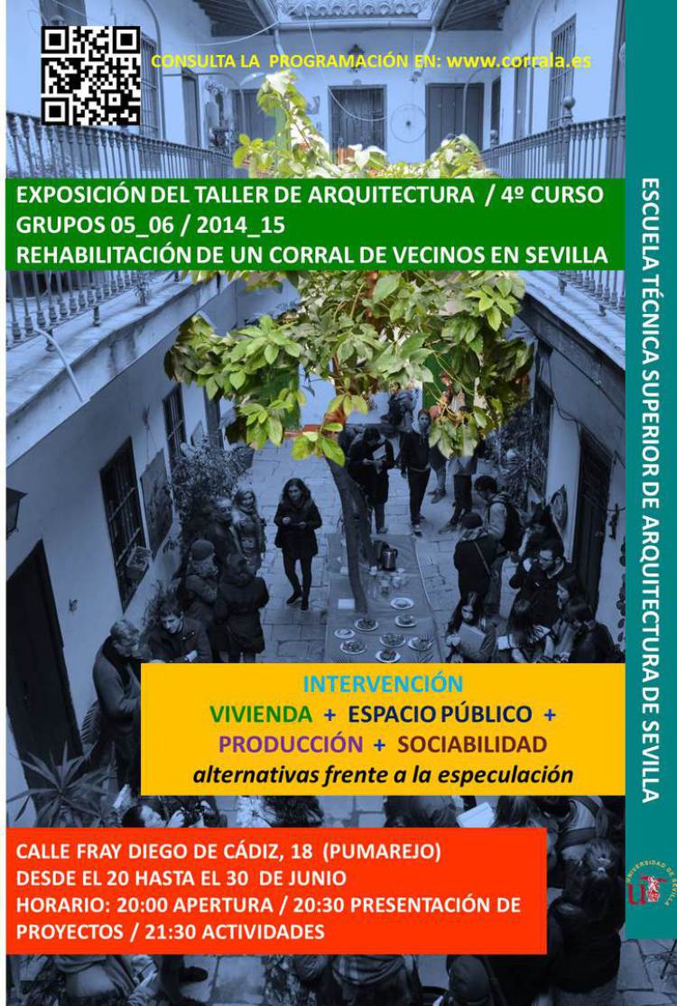El Taller de Arquitectura de la Escuela Técnica Superior de Arquitectura de la Universidad de Sevilla ha estudiado uno de los pocos corrales de vecinos que aún quedan tal como eran en su origen, tanto por la autenticidad del edificio como por la pervivencia de una cierta continuidad de vida tradicional. Han desarrollado varias propuestas creativas sobre microespacios culturales de música, cine y teatro, talleres de cerámica, centro social para menores, escuela gastronómica, casas gremiales, corral de comedias, escuela de flamenco… y así hasta 14 proyectos de intervención como alternativa a la especulación inmobiliaria. Desde el 20 al 30 de junio se celebrarán unas jornadas de puertas abiertas en el corral de vecinos de la calle Fray Diego de Cádiz 18 (zona Pumarejo), donde se expondrán los trabajos, recreando en vivo estas innovadoras propuestas así como algunas de las tradiciones de esa Sevilla del pasado. Estos futuros arquitectos han trabajado junto a sus profesores proyectos para hacernos ver cosas maravillosas que aún no existen en realidad, inventar formas de vida y costumbres distintas a las dominantes en nuestro entorno, romper el tiempo y el espacio conocido.